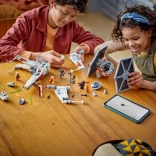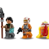 The box includes four detailed minifigures (Rebel Pilot, TIE Pilot, Yesi Scala, Sig Greebling) and the droid L3-G0, who can be seated behind the X-wing cockpit. Thanks to the opening cockpits, spring-loaded shooters, and folding landing gear, play is smooth, exciting, and incredibly versatile.