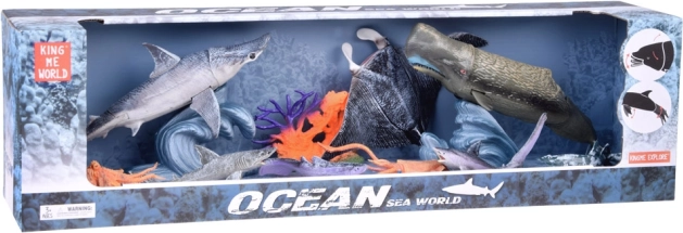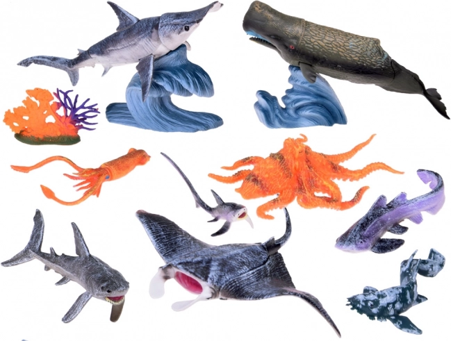 The box includes a manta ray, sperm whales, a hammerhead shark, an octopus, a squid, multiple shark types, a coral, and a pair of waves for scene building.