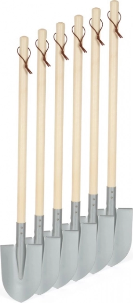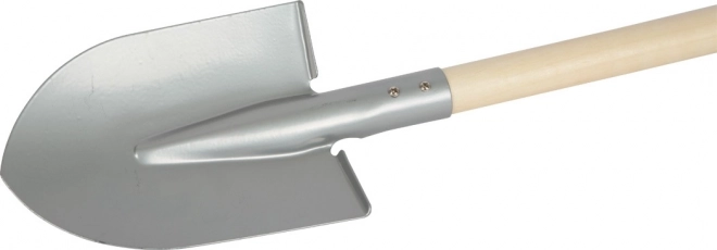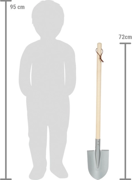 The pointed gray shovel is designed with children's needs in mind. With its weight and shape, it offers comfortable handling and supports kids in developing motor skills and a connection to nature. The shovel has a wooden handle that's easy for children to hold, and a metal head that's durable and suitable for work in garden beds and sandpits.