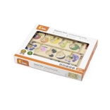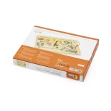 Colorful tracks, beads, and prints with numbers and fruit motivate children to recognize colors and practice playful counting.
