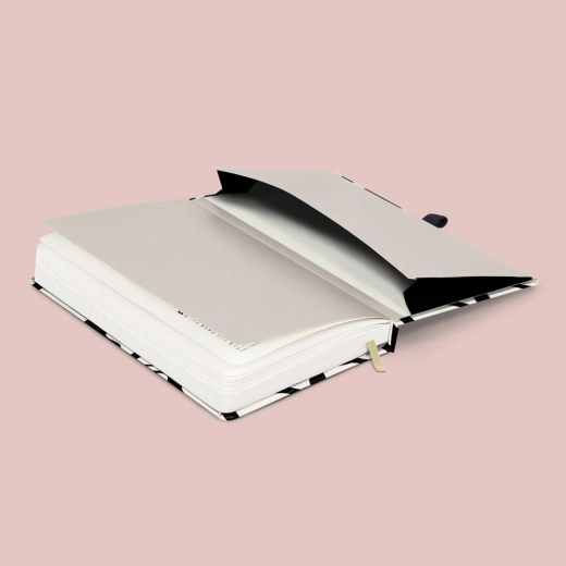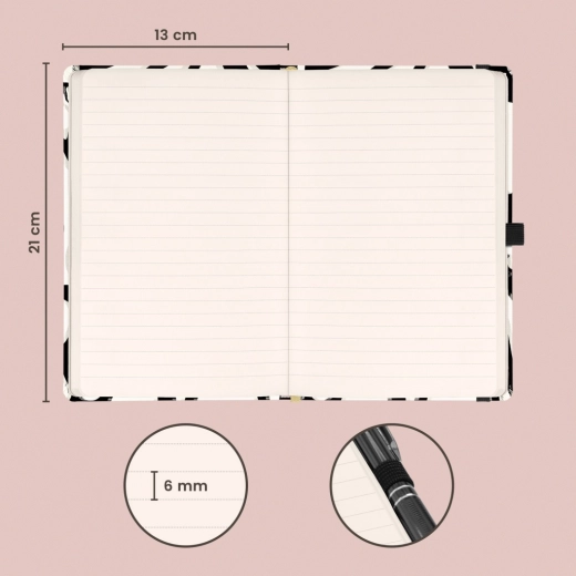 Inside, you will find 172 pages of pleasant yellow paper, ideal for daily writing, planning, and creative ideas. The compact 13 × 21 cm dimensions fit comfortably in a bag or backpack, and the inner pocket protects loose notes, business cards, or stickers.