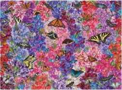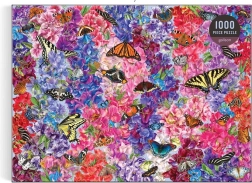 Detailed illustrations of butterflies in a floral landscape with a rich palette of pink, lavender, and blue tones delight the eye and invite you to complete the puzzle.