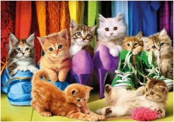 A cheerful image of kittens among shoes and yarn balls motivates kids to puzzle and decorates the children’s room once finished.
