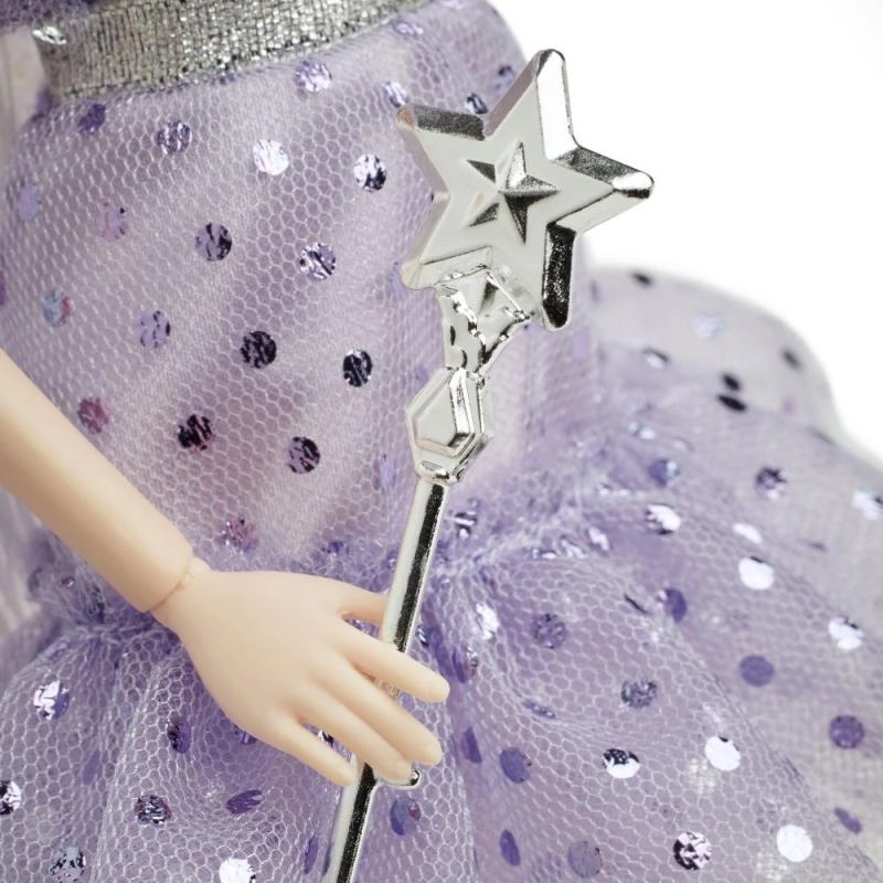 The purple ruffled dress, pearl belt, and glittering details give the doll a fairy-tale look that stands out on display.