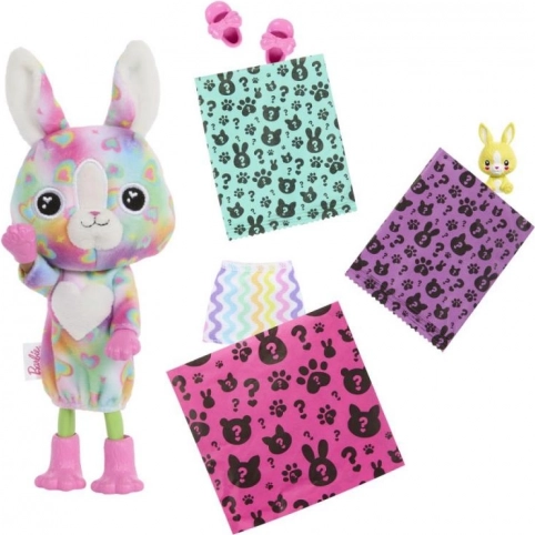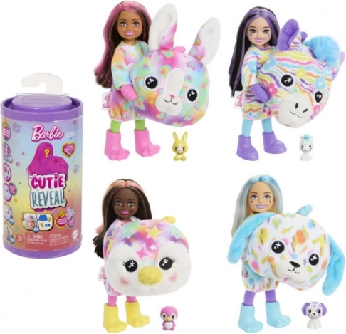 Barbie Cutie Reveal Chelsea Colorful Dreams dolls bring kids the joy of discovery and imaginative styling. The adorable plush costume (bunny, zebra, penguin, or dalmatian) transforms into an oversized coat for the doll after the reveal, and the costume head becomes a bed for the mini pet. Each unboxing hides up to 6 surprises and supports imagination and fine motor skills.