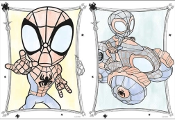 The coloring book contains 8 magic pictures that children can color using only a brush and a few drops of water. The pages have colored dots that spread to fill the picture with color when brushed.
