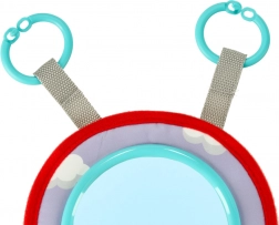 The colorful fabric mat with a mirror supports visual stimulation and longer focus during play, even on the go.