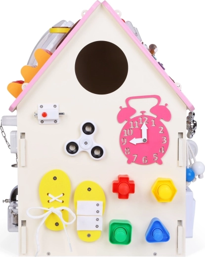 Discover a richly equipped activity board house that combines play and learning in one. Thanks to a variety of mechanical elements—locks, buckles, laces, wheels, and switches—children refine fine motor skills and logical thinking while nurturing creativity and curiosity.