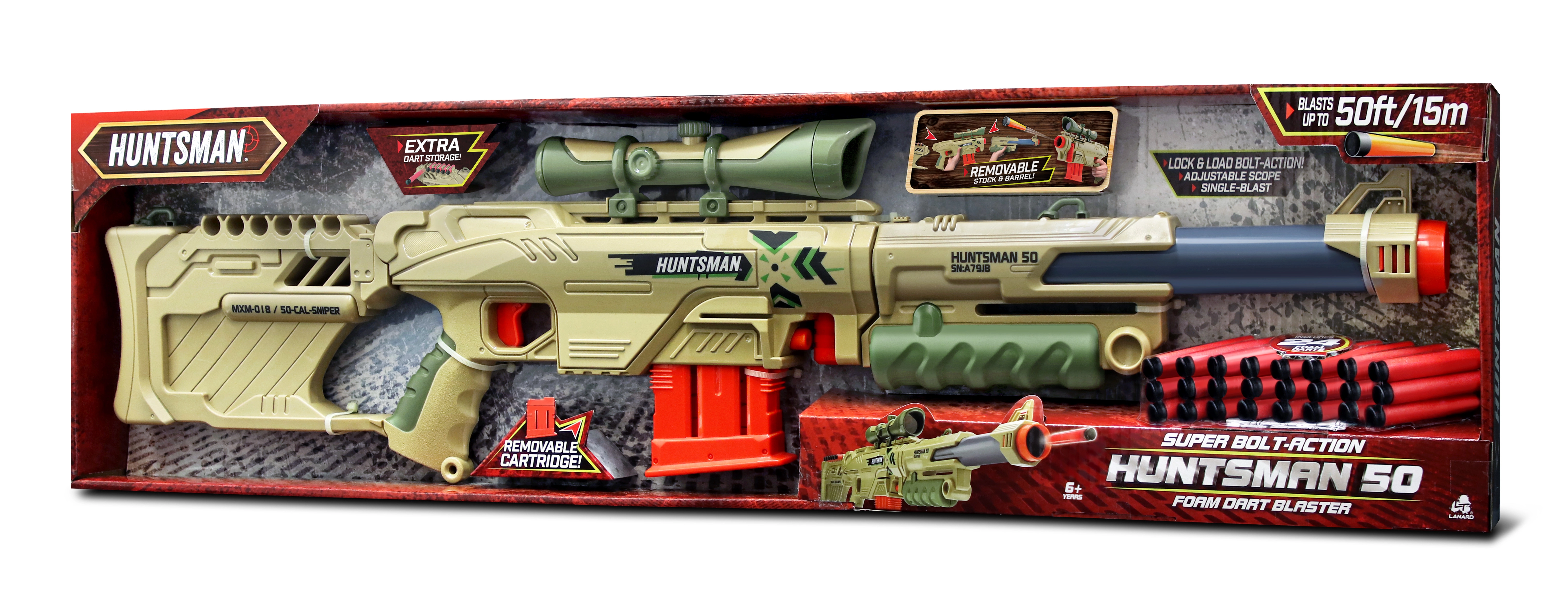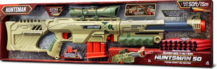 Enjoy action-packed fun with the largest blaster in the Huntsman collection – the Sniper Blaster 92 cm. Easily remove the barrel extension, stock, and sight to transform the long sniper rifle into a handy handheld blaster. The package includes 12 foam darts and the blaster is suitable for children aged 6 and up.
