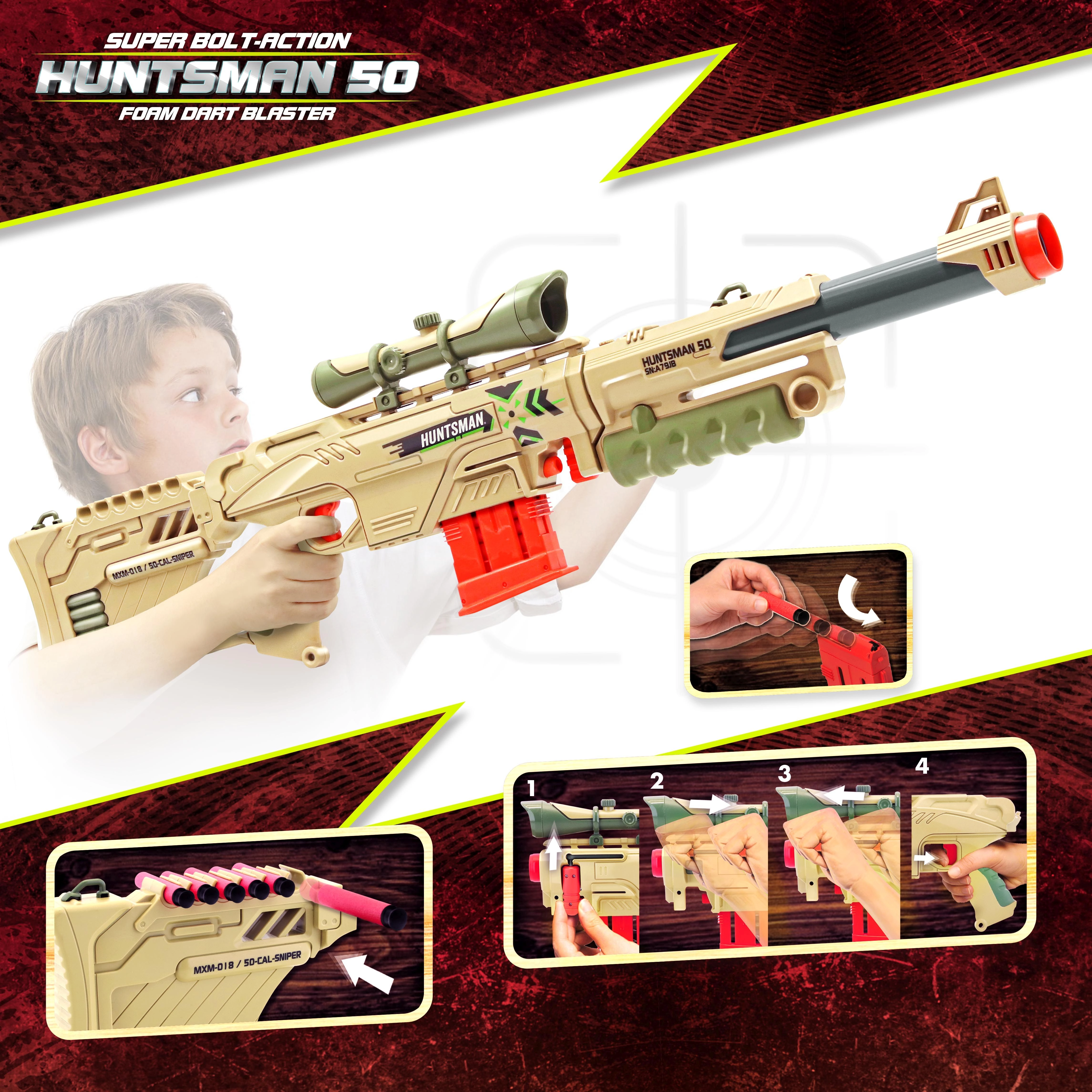 The Huntsman Sniper Blaster is a versatile toy for young shooters and enthusiastic collectors. Thanks to its modular design, you can switch in moments from a long sniper rifle to a compact handheld blaster. Easy handling, safe foam darts, and an attractive design guarantee hours of safe and creative fun.