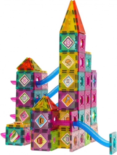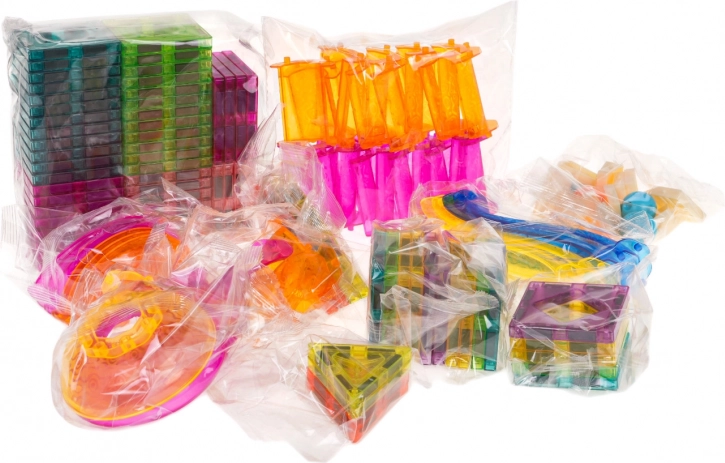 This extensive building set combines magnetic tiles and marble run elements, so children aged 3+ can build towers, castles, and unique tracks for colorful marbles. The pieces are made of high-quality, smooth plastic in vibrant colors; magnetic edges connect easily and firmly, so constructions remain stable even when tall.
