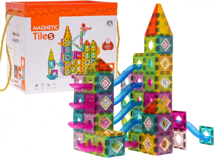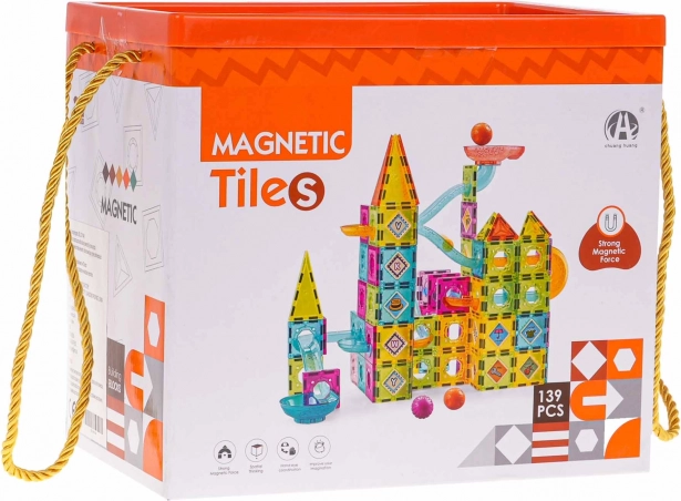 Magnetic building set with castle and marble run, 139 pieces. Strong magnets, stable structure, box with sorter, educational toy for children aged 3+.