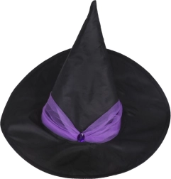 A classic black hat with purple accents perfectly completes the costume and enhances the witchy vibe.