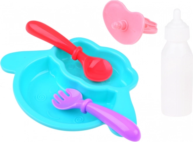 A bottle, pacifier, and a plate with cutlery support feeding play and care routines. Accessories like the potty and towel complete the authentic 'little parent' role-play experience.