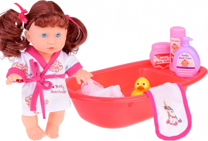 This interactive baby doll with blue eyes and long chestnut hair boosts children's imagination and caregiving skills. With a soft rubber head and plastic body, it feels pleasant and realistic during play. Kids can prepare a bath in the water-filled tub, dress the doll in the robe, and take care of everyday rituals.