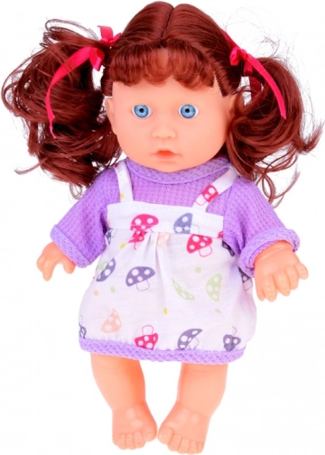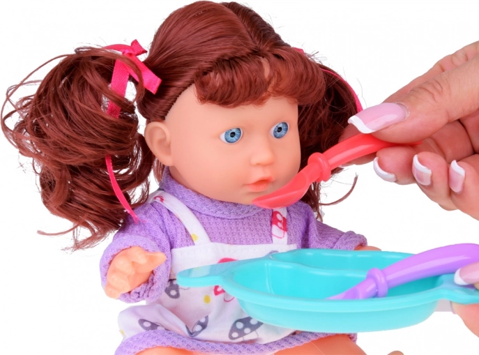 - In the box you'll find: a baby doll with sound module (says 'mama', 'dada', laughter, crying), water-fillable tub, potty, duck, bath 'cosmetics', sponge, feeding bottle, pacifier, towel, robe, plate and cutlery.