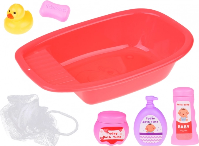 The tub can be filled with water for sensory play with the duck, sponge, and 'cosmetics'. Children practice baby care and basic hygiene rituals.