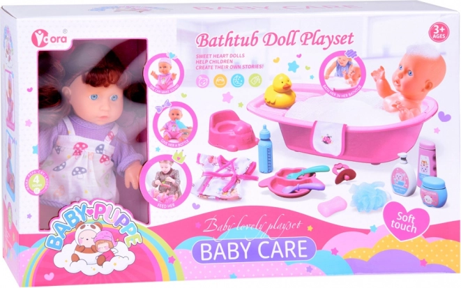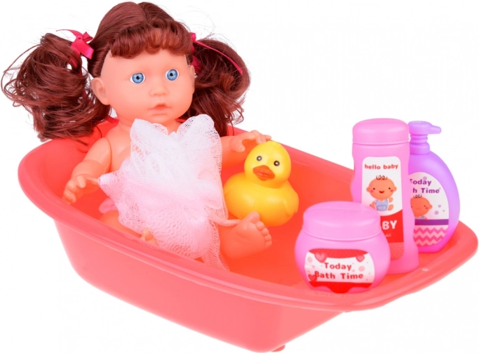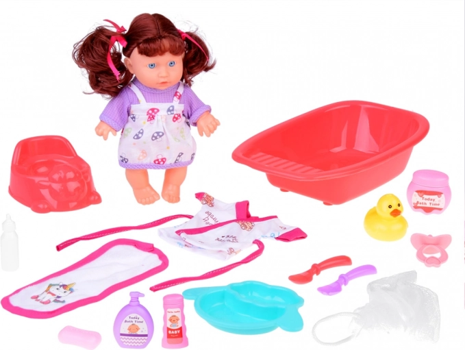 A fun play set for pretend caregiving with an interactive talking doll that says 'mama' and 'dada' and makes realistic sounds. Includes a bathtub, potty, duck, cosmetics, robe, towel, and feeding accessories—everything to develop imagination and empathy. The doll measures 23 cm and is powered by 3× AG13 (included).