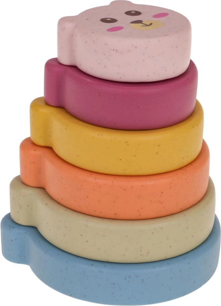 • Tower of construction elements measuring about 8.5 cm x 10.9 cm; smallest element about 4.5 cm x 4.5 cm, largest element about 8.5 cm x 8.5 cm.