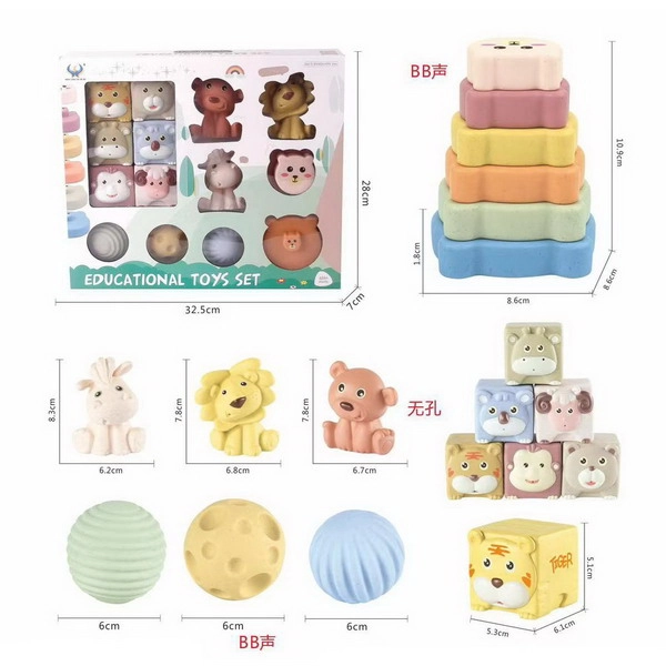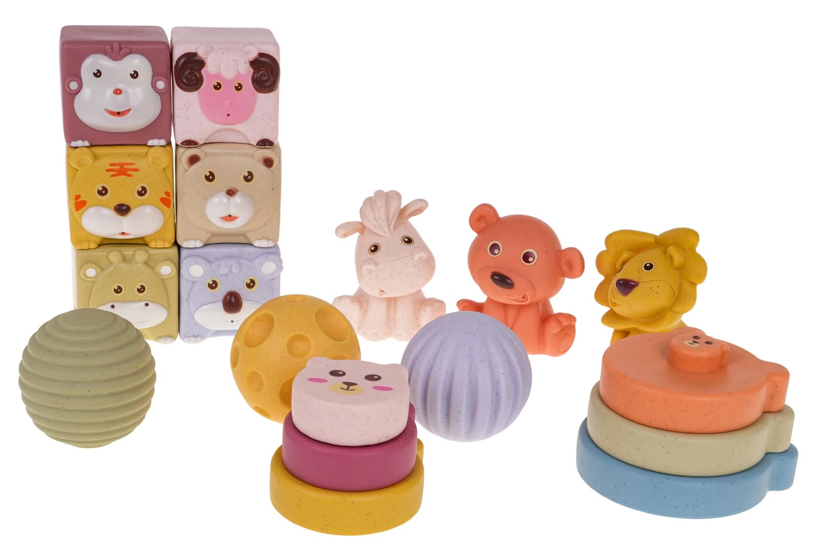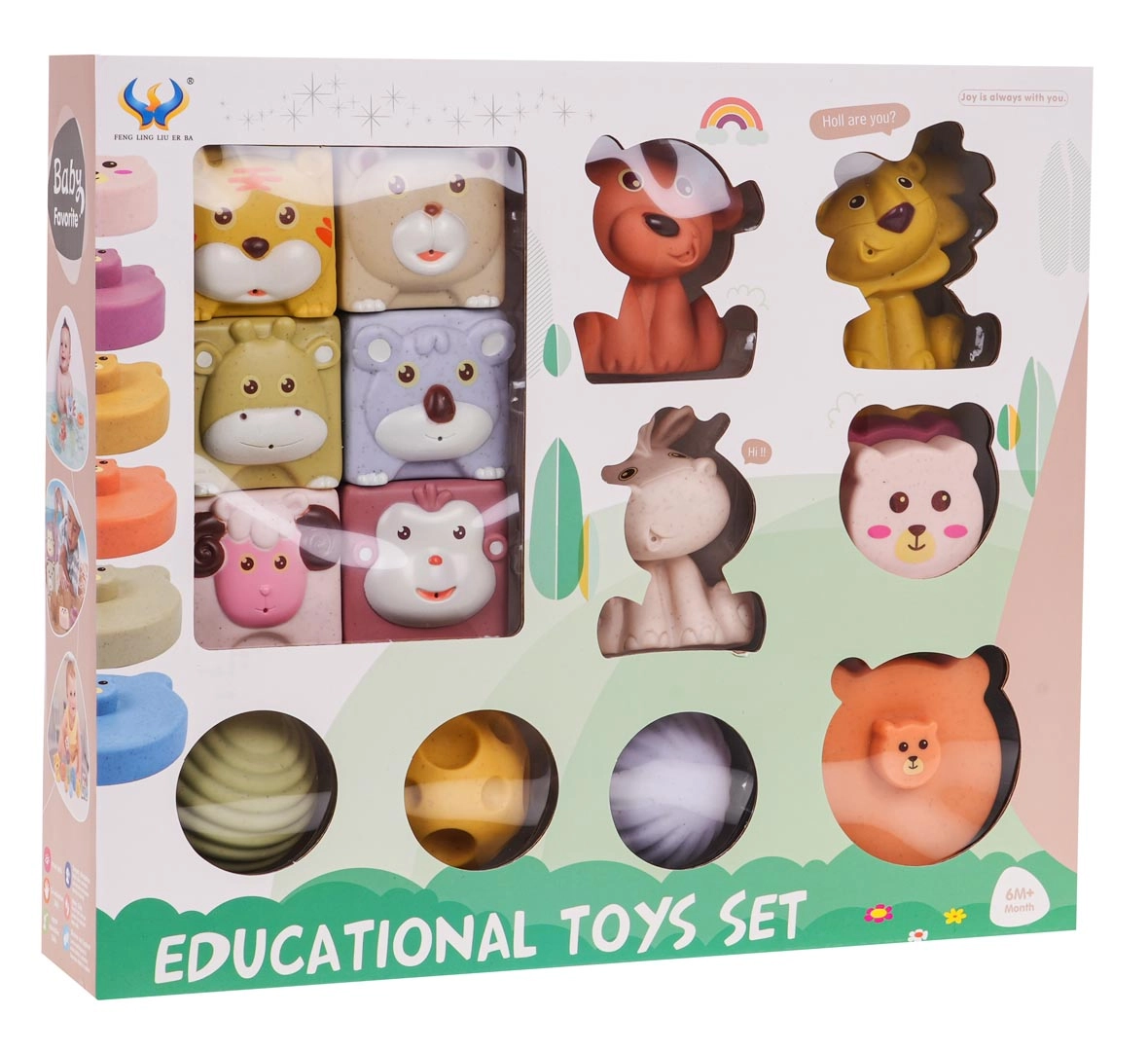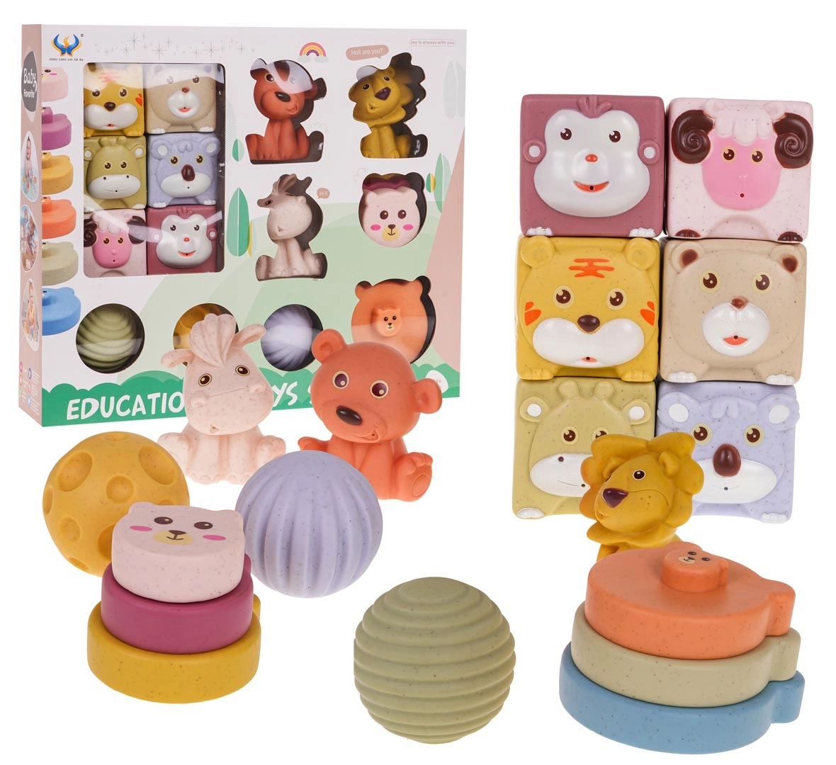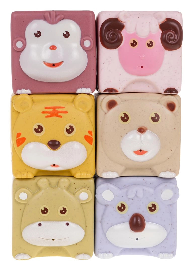 • 6 animal cubes: monkey, sheep, tiger, bear, deer, koala, each with a different texture and color.