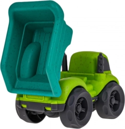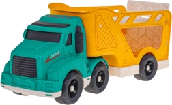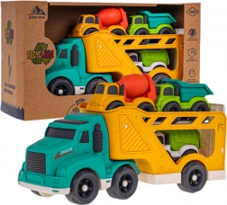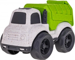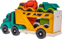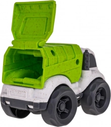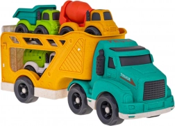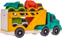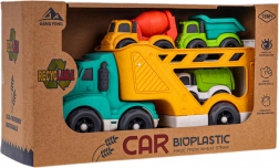 A colorful set of toy cars made from eco-friendly bioplastic with a large tow transporter will delight children from 18 months. It offers moving parts, durable construction, and safe, nature-friendly materials. Kids enjoy realistic play thanks to the rotating mixer drum, tipping dump bed, and openable rear doors on the garbage truck.