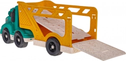 This eco set includes a large car transporter with a detachable trailer and three work vehicles. Made from bioplastic (straw/eco material), it is safe for children and gentle on the environment. Smooth shapes, vivid colors, and a robust build support imagination and independent play.