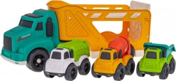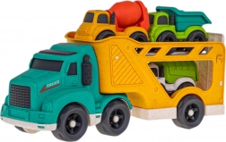 The transporter features a folding loading platform and all vehicles have free-rolling wheels. Children can move the cars by hand across the floor, practicing coordination and fine motor skills. The mixer has a manually rotating drum, the dump truck has a manually lifting bed, and the garbage truck has openable rear doors.