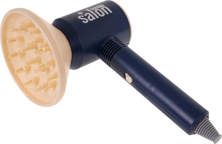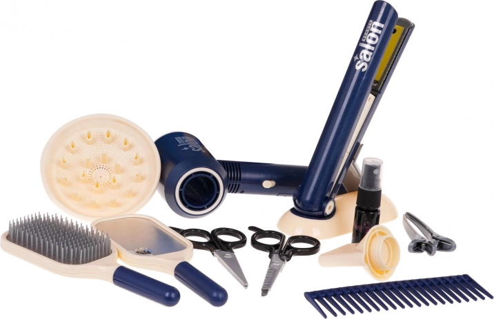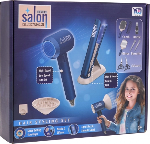 The set is equipped with special features. . | An interactive, well-equipped hairdressing set with a hair dryer with interchangeable nozzles and a battery-powered hair straightener, designed for children aged 3 and up. The set includes a wide range of hairdressing tools including a hair dryer, straightener, scissors, combs, and other accessories. The hair dryer blows air. It has two airflow settings and makes realistic drying sounds. The hair straightener features light effects and sounds accompanying hair straightening. The dryer is powered by 3 x AAA 1.5 V batteries (not included), the hair straightener by 2 x AAA 1.5 V batteries (not included). .. Set features: . - suitable for children over 3 years old, .- made of top-quality materials, .- dryer with interchangeable attachments (diffuser and concentrator nozzle), .- the dryer blows air, .- the dryer has two airflow settings, .- the dryer makes sounds while drying, .- the straightener has a slider for closing and opening, .- the straightener has a light, .- the straightener makes sounds characteristic of hair straightening, .- practical stand for the hair dryer or hair straightener. . |
