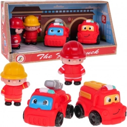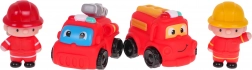 - Box contents: firefighter with red helmet, firefighter with yellow helmet, fire truck with ladder, fire truck with hose