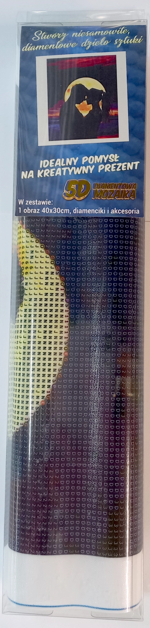 Diamond painting – instructions: The top side of the canvas is coated with adhesive and covered with a clear film. Remove the film gradually, section by section, as you apply the gems. Removing the entire film at once may contaminate the adhesive layer and reduce gem adhesion. The canvas contains symbols listed in the included key, which refer to the corresponding bag of gems marked with a number. Pour the gems from the selected bag into the tray. Pick up wax into the tip of the pen so the gems easily stick to it. Apply the gems to the picture with the pen. After finishing a given color, pour the remaining gems back into the bag and continue with the next color.