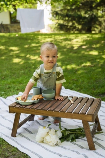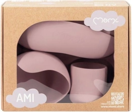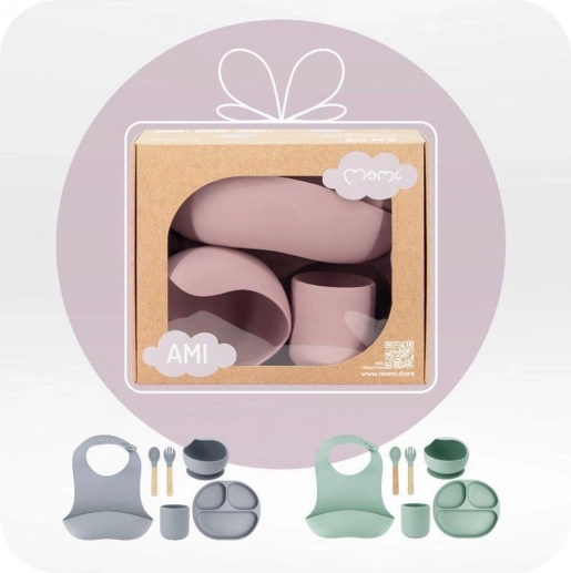 MoMi AMI is a tableware set designed to help children learn to eat independently. The set includes: a bowl and a plate with suction bases, a cup, cutlery with wooden handles, and a comfortable, soft bib with a pocket. MoMi AMI tableware is made of food-safe silicone. It contains no BPA or phthalates. The set comes in a colorful gift box!