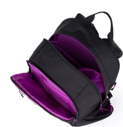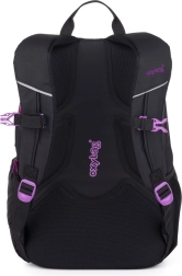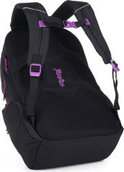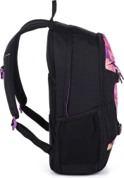 A black base is complemented by a pink‑purple marbled pattern and bold details. The backpack suits school, work, and free time.