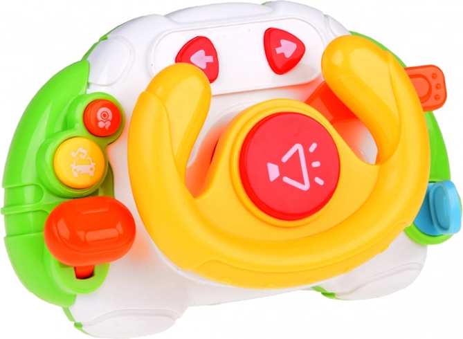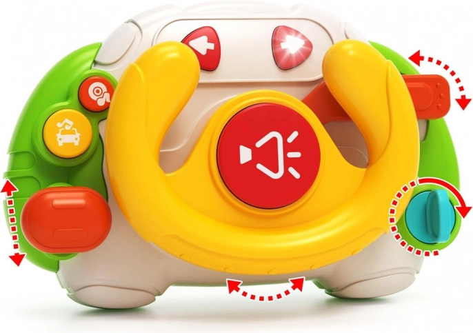 The wheel is designed to fit easily in a stroller or travel bag. Thanks to intuitive buttons, kids quickly learn the controls: the red button for the horn, the yellow for melodies (3 types), and the blue for sounds and music (4 types). When music plays, the center of the wheel lights up rhythmically.