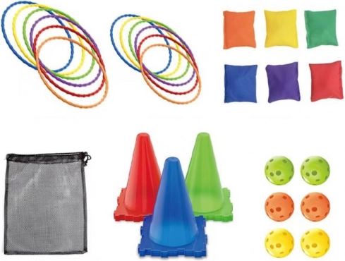 Discover the 3-in-1 Target Sports Games Set for endless indoor and outdoor fun. Includes cones, rings, bean bags, and balls to enhance motor skills and coordination. Perfect for kids aged 3+.