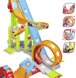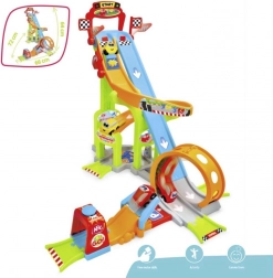 A fun kids’ car track that brings hours of action and creativity. It features starting boxes, a launcher, a loop, a workshop, a parking area, and barriers. The large size of 66 × 72 × 64 cm and 2 cars included guarantee high-speed races and imaginative play for the little ones.