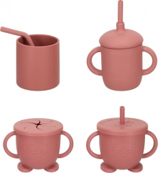 Complete silicone tableware set for children in dark pink color includes plates, bowls, cups, and cutlery. The tableware is made from safe silicone, easy to clean, and ideal for learning independent eating.