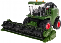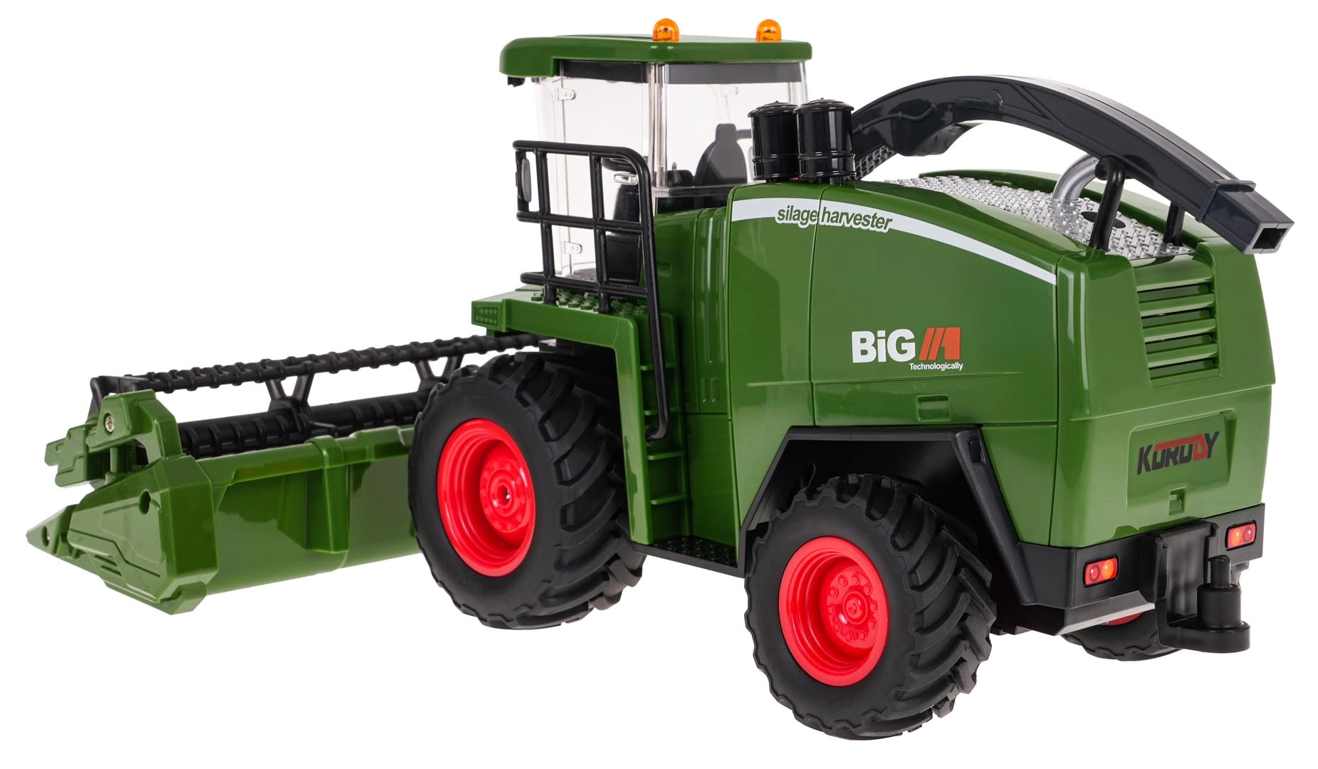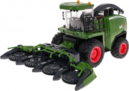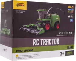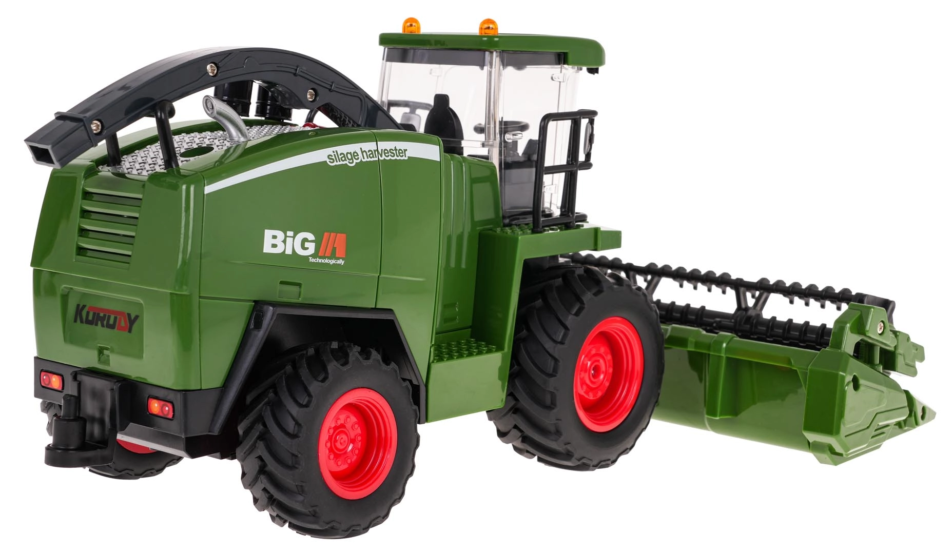 A realistic RC 2-in-1 combine harvester for children aged 3+ featuring interchangeable headers for grain and corn, light and sound effects, and even a smoke effect. With 2.4 GHz remote control, it drives smoothly in all directions, and rubber tires ensure good grip.
