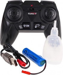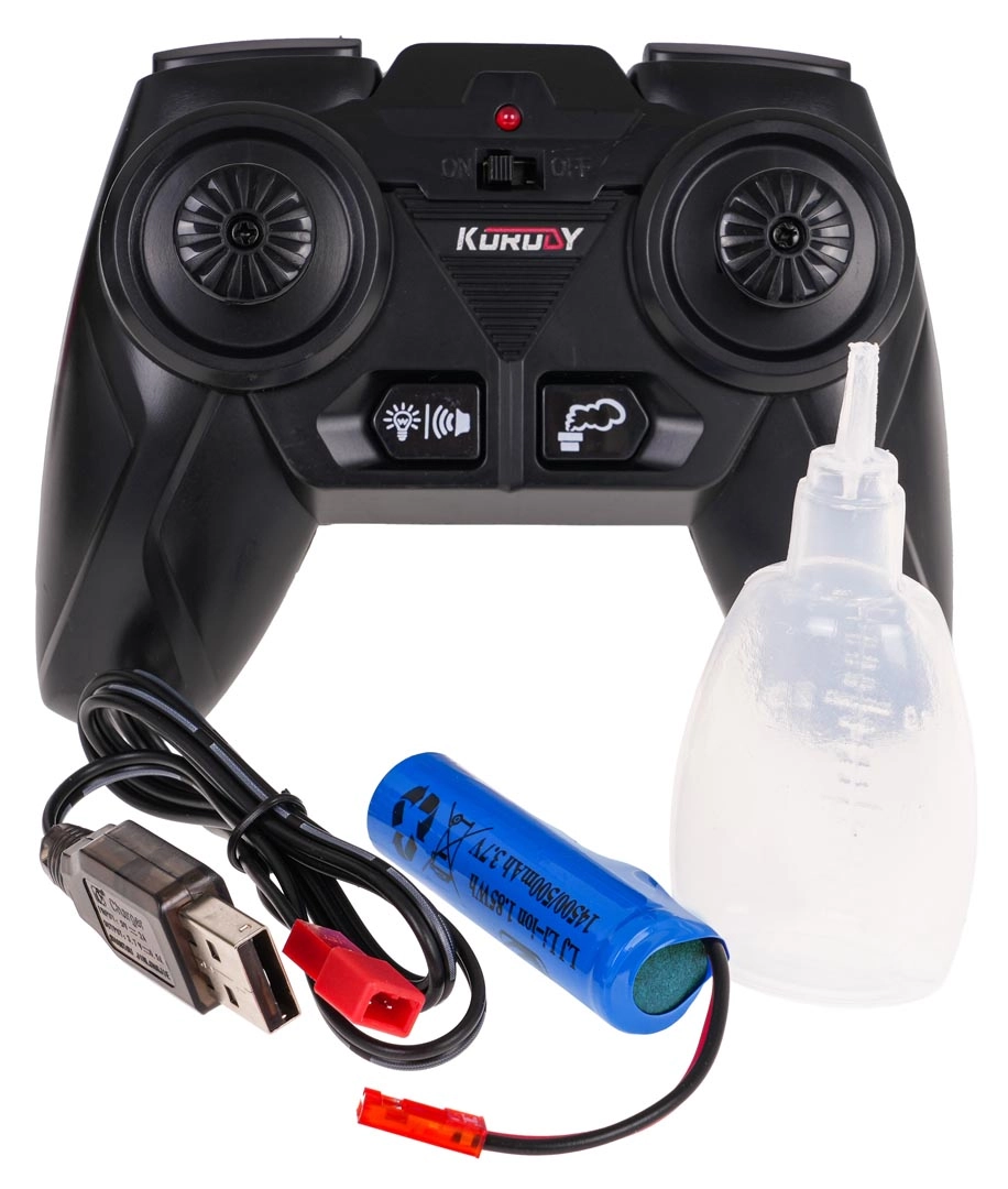 The 2.4 GHz remote control enables smooth steering forward, backward, right, and left without interference. The built-in 3.7 V 500 mAh rechargeable battery provides plenty of playtime and charges via USB. Activate the smoke effect using the included water bottle for an even more realistic experience.