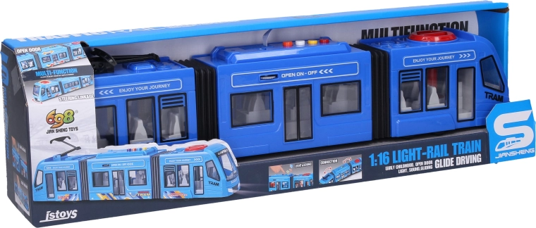 A realistic tram for young and adult fans of urban transport. It offers light and sound effects, freewheel, and easy control using buttons on the roof. Thanks to the opening middle doors and steerable front wheels, play is even more fun. 3× AG13 batteries are included, so you can hit the tracks right away.