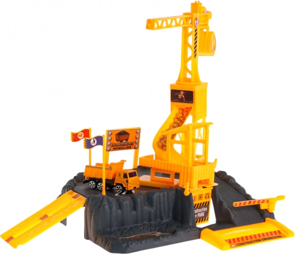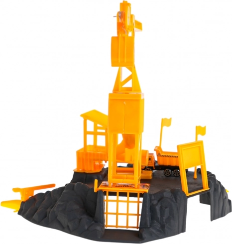 Includes a small construction vehicle that can drive up the ramp and deliver materials to the platform under the crane.