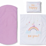 A soft little pillow, blanket, and pad with cheerful rainbow motifs and text let you change the crib’s look to match the mood.