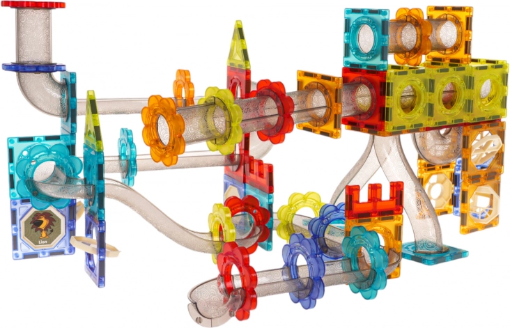 A colorful magnetic block set for children aged 3 and up. The set contains 176 pieces and lets you build a marble run in any configuration. Some pieces are battery-powered; when switched on, they light up the track with pulsing lights to make play more engaging. The lights pulse in 3 modes: fast, medium, and slow, so you can choose the mode that suits your child. Several balls also flash their lights when shaken. The set also includes several colorful capsules that glow and change colors, and several LED spotlights. The set is powered by a total of 12 x LR1130, 6 x LR41, and 8 x CR1220 batteries. All batteries are included. The bricks are made of high-quality plastic, smooth and carefully finished. They connect using built-in magnets. The magnets hold very well and ensure structural stability. An illustrated guide for assembling sample tracks is included. . |