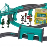 The box includes everything for a complete scene: tracks, bridge, tunnel, cardboard supermarket, traffic signs, trees, 4 cars, a figure, and a lamp. Thanks to the 92 elements, you can rearrange the set freely and create new routes over and over.