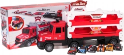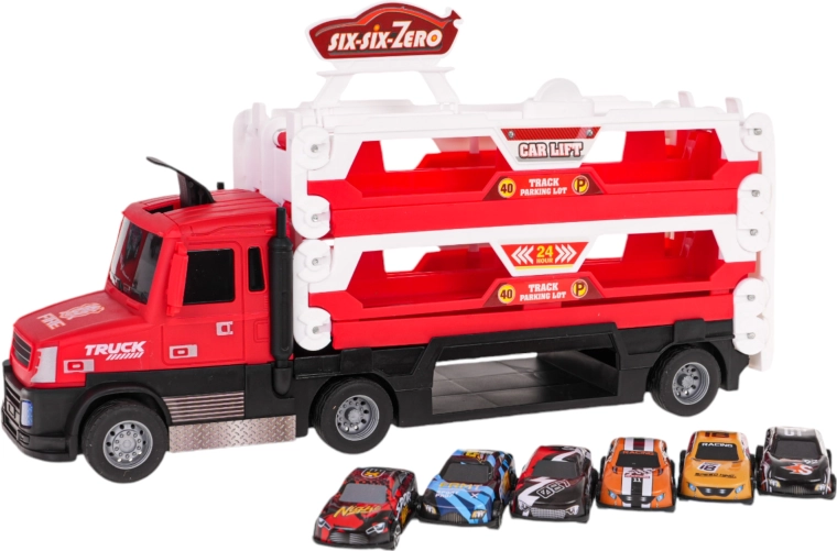 Pressing the front of the truck activates engine and braking sounds and flashing headlights, enhancing the realistic play experience. The box includes 6 die-cast cars, so you can start racing right after unboxing.