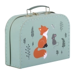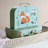 Discover a charming set of two suitcases featuring illustrations of a fox, an owl, and other forest friends. Thanks to the two sizes, you can easily organize toys, crayons, and tiny treasures. The durable cardboard construction with quality stitching withstands everyday use, while the metal handle and clasp ensure comfortable carrying and secure closure.