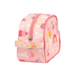 A cute pink toiletry bag with an ice cream pattern, ideal for trips, camps, and everyday use. It offers a spacious main compartment, a practical handle for easy carrying, and a lightweight, easy-to-clean material.