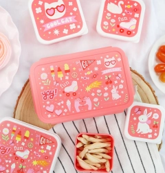 A cute coral pink lunch box with a fun motif, perfect for school and trips. It has an airtight snap-on lid and a removable tray with two compartments to keep snacks neatly organized. Lightweight, durable, and ready for colorful lunches kids love.