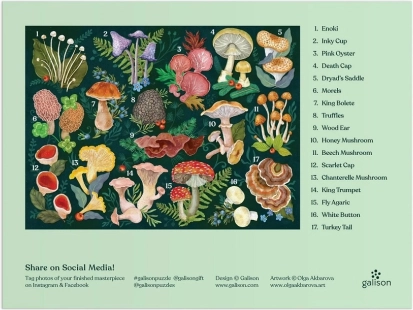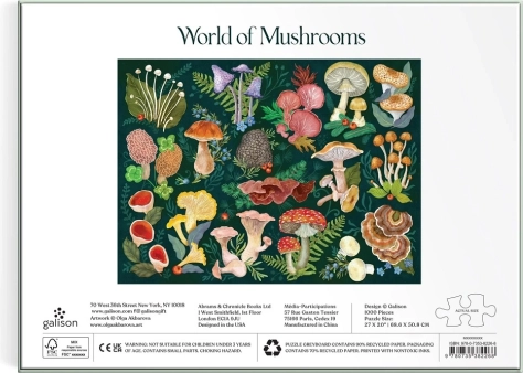 GALISON Mushroom World puzzle with 1000 pieces made from FSC paper. Precise craftsmanship, non-toxic inks, reference image included. A great gift for nature lovers.