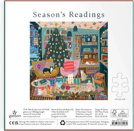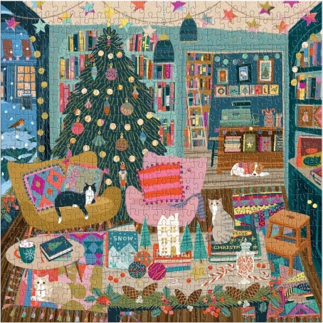 Immerse yourself in the holiday mood with the GALISON Season’s Readings puzzle, depicting a cozy interior with Christmas decor, bookshelves, and cats. The foil effect adds an exceptional sheen and turns the completed puzzle into a decorative artwork that brightens your home beyond the Christmas season.