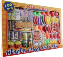 Large food set. The package contains a total of 100 pieces (fruits, vegetables, baked goods, sweets, cans, and carton drinks). Package dimensions approx. 58x39x5 cm. Age 3+.